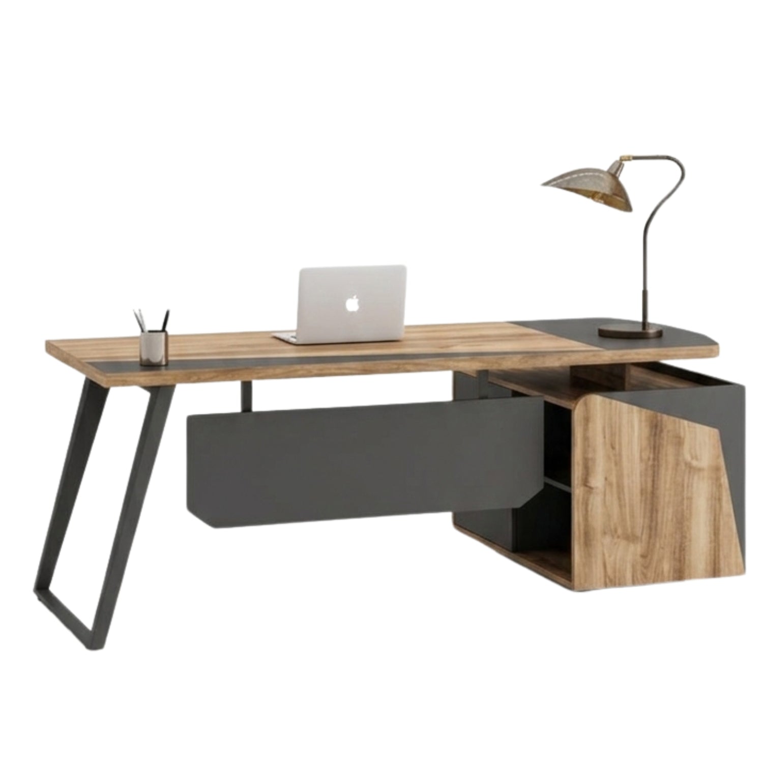 The Elara is not just a workspace; it is a statement of contemporary professional elegance. Designed for those who appreciate the intersection of industrial ruggedness and organic warmth, the Elara executive desk breaks away from traditional silhouettes to offer a bold, asymmetrical aesthetic.